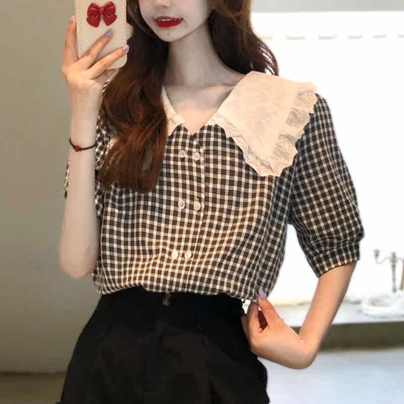 夏胖mm大码娃娃领格子衬衫宽松显瘦遮肚子微胖减龄上衣设计感炸街热门设计联盟服务商